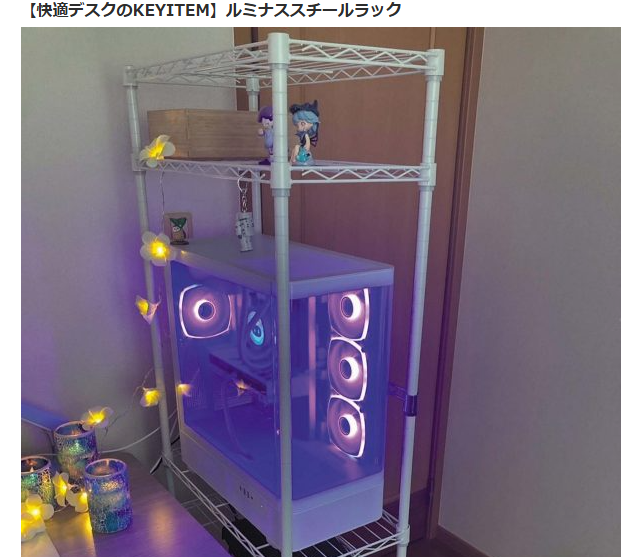 「デスクが120cm幅で、PCをデスクの上に置けないため、サイドに白のスチールラックを設置しました。『ルミナス』はサイズもカラーも豊富で、様々なデスク環境に合わせやすくオススメです!」
