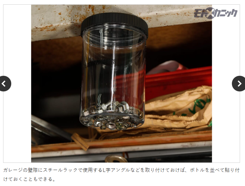 ボルトやビス類はもちろん、メンテ作業中に取り外した部品を保管するにも便利な収納アイテム。佃煮や味つけ海苔の容器を再利用する手もあるが、この製品は割れる心配のないPET素材で同じサイズのボトルを整然と並べて置くことができる。
