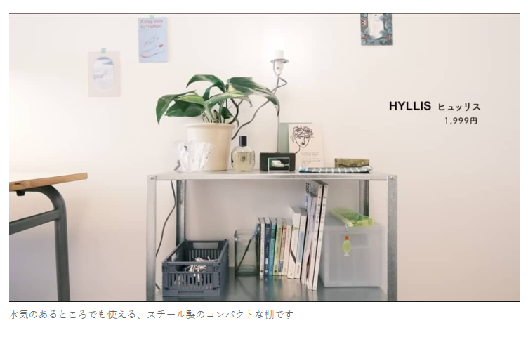 最初に紹介しているのは、スチール製の棚「HYLLIS(ヒュッリス)」。屋外のガーデニングなどにも使える仕様ですが、河原さんはこちらを室内で使っています。シンプルかつコンパクトで4畳半の部屋にはちょうど良くて、本やインテリアグッズを飾る場として使用しています。日本では1999円とかなり安く購入できます。