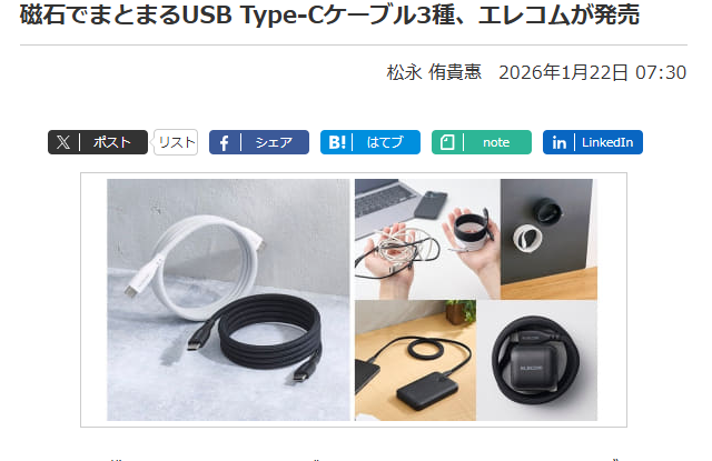 エレコム株式会社は1月20日、マグネットでまとまるUSB Type-Cケーブル「MPA-CCTMG」シリーズを発売した。