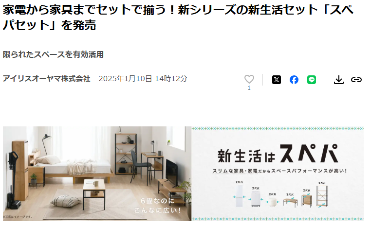 アイリスオーヤマ株式会社(本社:宮城県仙台市、代表取締役社長:大山 晃弘)は、限られたスペースを広く有効活用できるようスリムな家電や家具を揃えた新生活セット「スぺパセット」を2025年1月17日より全国のホームセンターやインターネットサイトを中心に順次発売(※1)します。