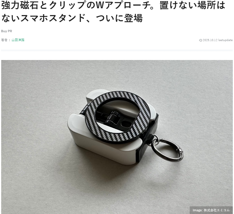 強力磁石とクリップのWアプローチ。置けない場所はないスマホスタンド、ついに登場