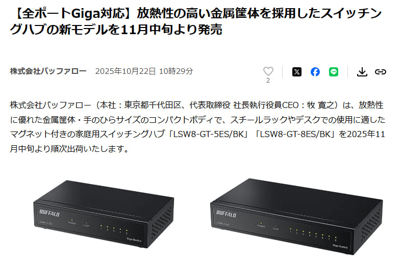 株式会社バッファロー(本社:東京都千代田区、代表取締役 社長執行役員CEO:牧 寛之)は、放熱性に優れた金属筐体・手のひらサイズのコンパクトボディで、スチールラックやデスクでの使用に適したマグネット付きの家庭用スイッチングハブ「LSW8-GT-5ES/BK」「LSW8-GT-8ES/BK」を2025年11月中旬より順次出荷いたします。