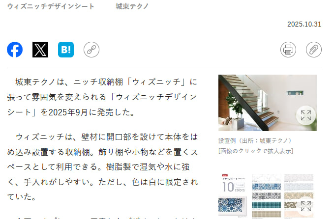 城東テクノは、ニッチ収納棚「ウィズニッチ」に張って雰囲気を変えられる「ウィズニッチデザインシート」を2025年9月に発売した。