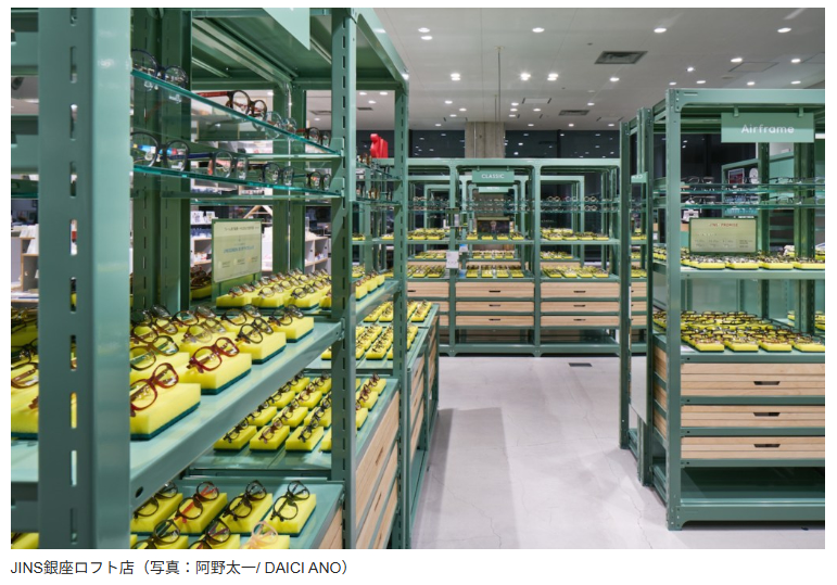 JINSの東京・銀座ロフト店の設計した長坂常さんは「まず眼鏡置きを考えましょう」と提案し、日用品を比較検討した結果、「Scotch Brite(スコッチ・ブライト)」のスポンジが最適と判断。スポンジが日常的なものであることから什器にはスチールラックを選び、不足する部分はカスタマイズ。「スポンジの上に眼鏡」という発想には強い違和感を持ったが、結果として新鮮でおしゃれな店舗が2019年に生まれた。