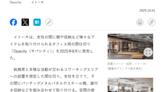 記事タイトル支柱の間に棚や収納などを取り付けられるオフィス用の間仕切りサイト名日経XTECH記事公開日2025年10月1日記事概要イトーキは、オフィス用の間仕切り「Opacity(オパシティ)」を発売しました。関連リンク支柱の間に棚や収納な...